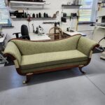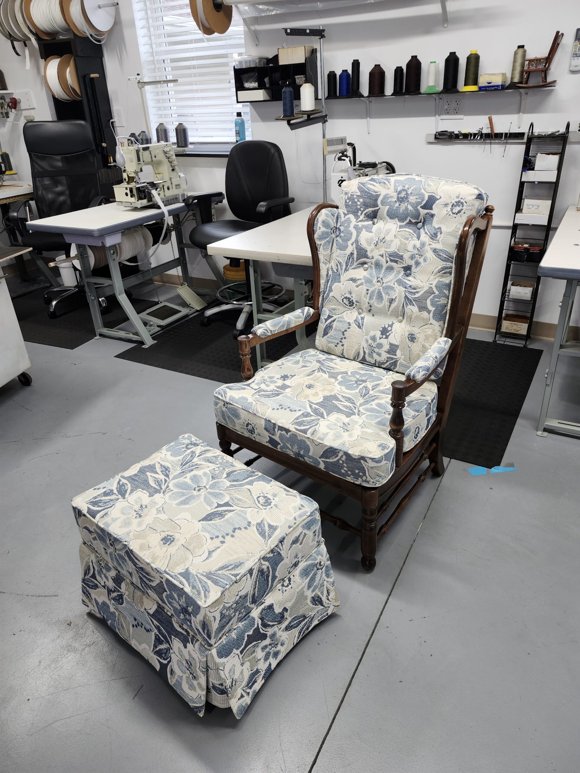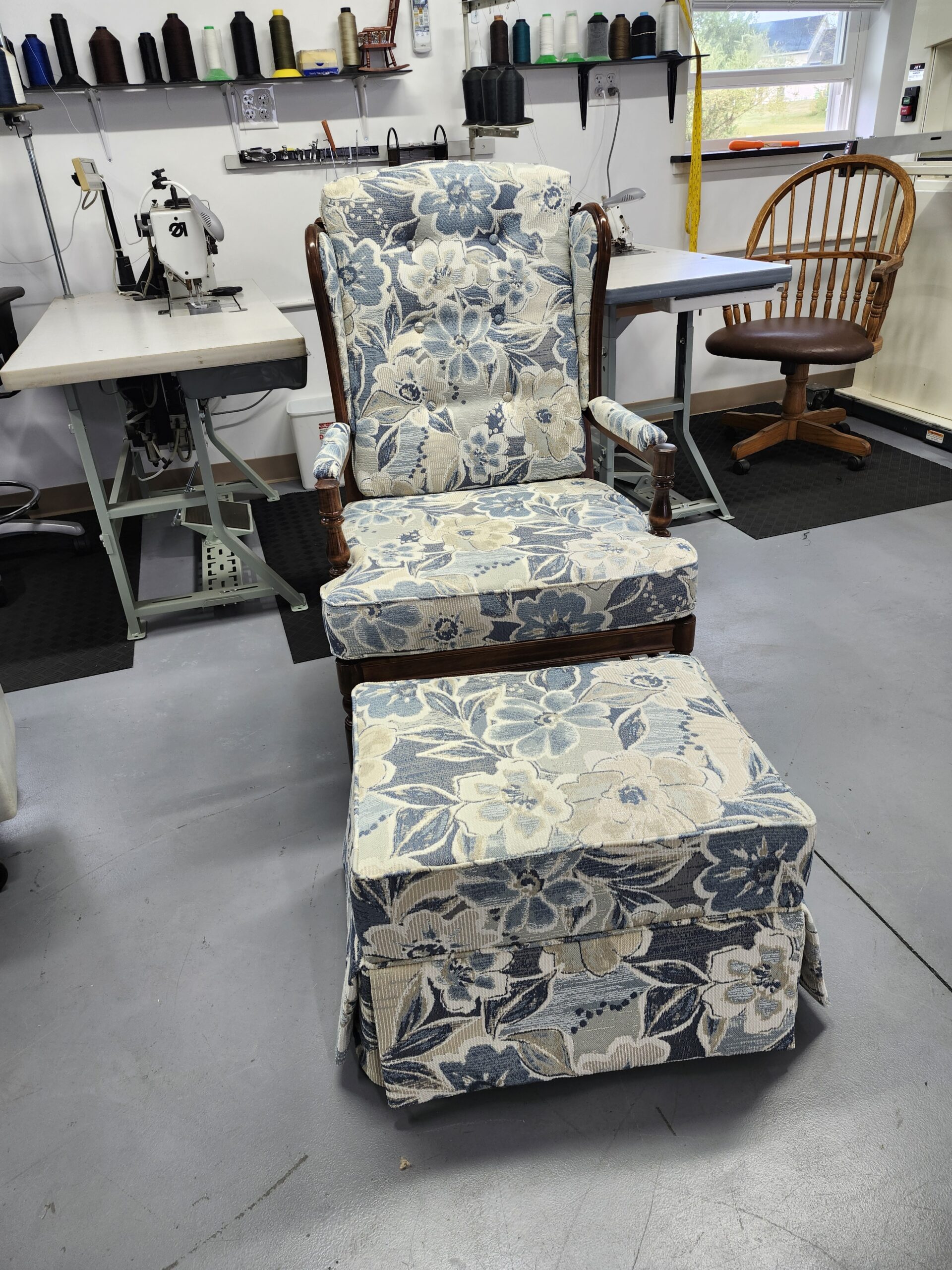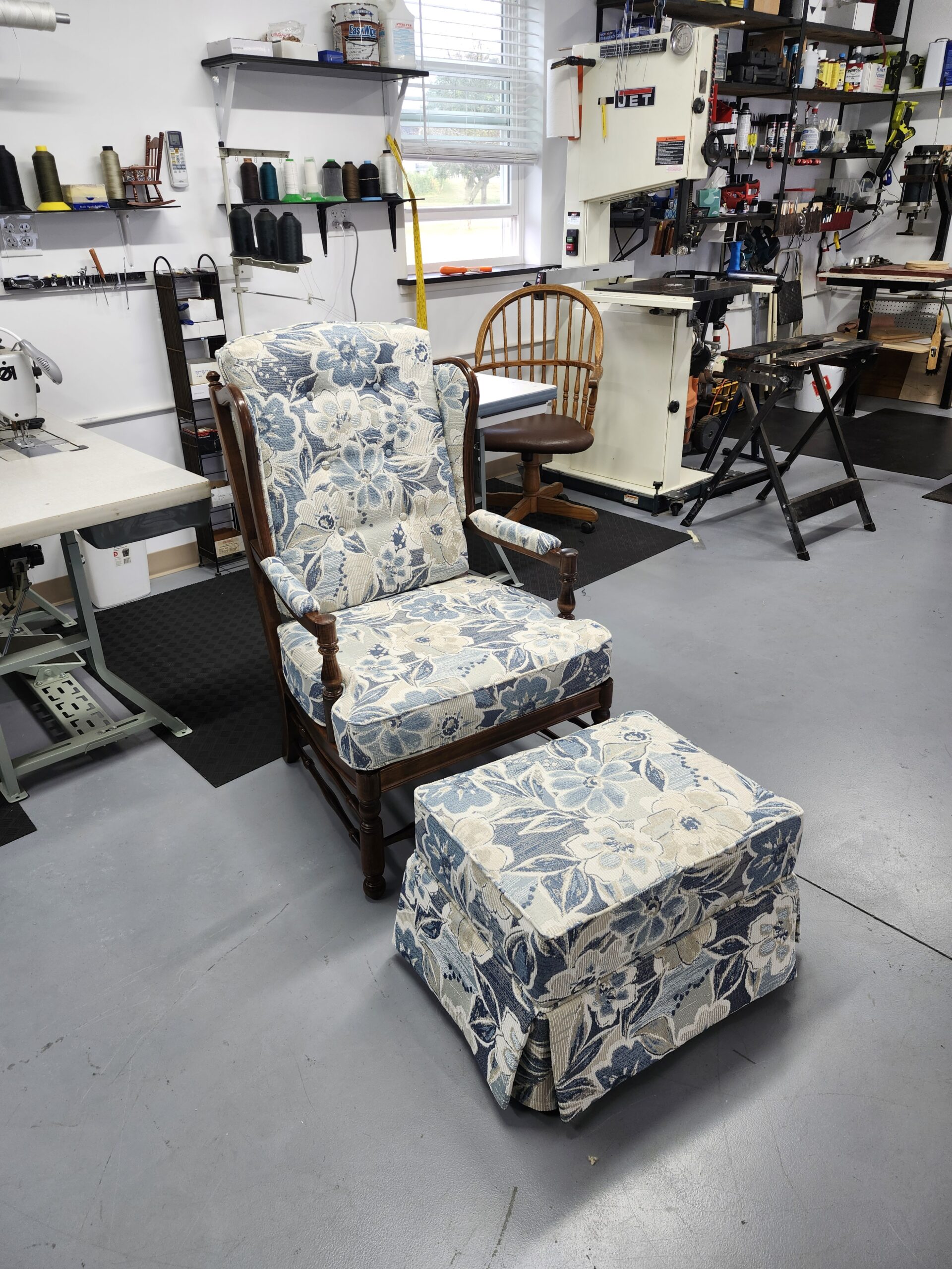 We carefully stripped the old materials, reinforced the inner springs and padding, and fully reupholstered both the chair and ottoman using a stunning vintage-inspired floral chenille fabric. The soft, textured material in hues of dusty blue, cream, and muted green created a timeless, elegant look — true to the spirit of traditional American craftsmanship.